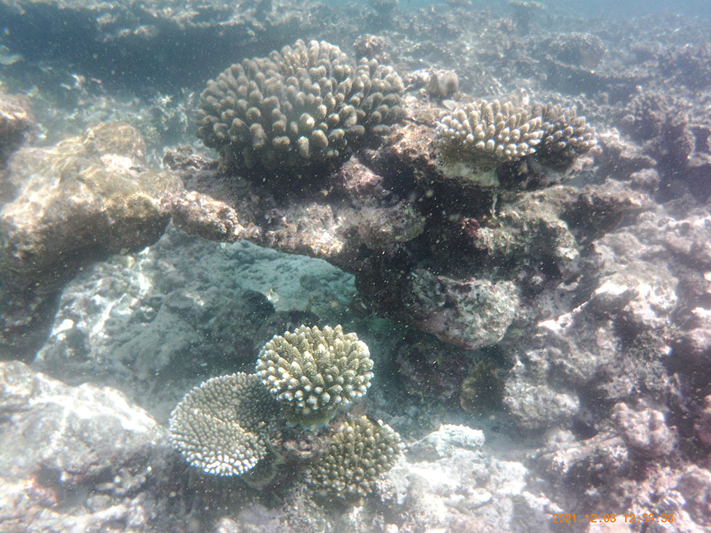 Koralni greben koji okružuje ostrvo omogućava život celokupnoj zajednici. Malu lagunu unaokolo duž obale i sve do grebena nastanjuju sitni korali različitih vrsta, zaista prelepih, u više boja i oblika, a to se isto može reći i za koralne ribe. Podvodni svet ostrvskih laguna je nešto zaista posebno i na tom mestu sam otkrio jedno potpuno novo iskustvo i zadovoljstvo dok je Davor strastveni ljubitelj podvodnog sveta od malih nogu. U momentima smo se nalazili u situacijama da smo imali osećaj kao da smo u jednom od onih velikih akvarijuma kojim pored vas prolaze jata riba u svim mogućim jarkim bojama. Naravno tu su bile i morske kornjače ali i bebe koralnih ajkula. One nisu baš voljne da nam prilaze ali su bliski kontakti na momente vrlo mogući, uz malo sreće. Savet je svakako uvek tokom plivanja ili snorklinga nositi obuću za plivanje ili peraja, osim ako želite posekoteine korala i bodlje ježeva po tabanima. A ako vam to nije dovoljno, tu su i Stonefish, jedno od najotrovnijih podvodnih bića koje voli život među koralima u lagunama. Mirno leže među ostacima mrtvih korala od kojih ih je po boji i obliku skoro nemoguće razlikovati.