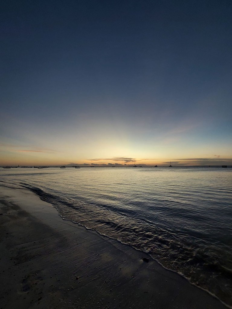 Brod nas je sve iskrcao na drugom kraju obale u odnosu na mesto ukrcavanja. Tamo nas je čekao Nasir. Nadali smo se da je i dalje tako, a nismo imali pojima gde se nalazimo. Naslutili smo po logici stvari da treba da se zaputimo plažom, prosto, na jug. Sunce je treperilo ravno na horizontu dodirujuću okean, još uvek ne napuštajući nebo. Spektakularan prizor! Bilo je mnogo ljudi na plaži. Svuda su bile žurke koje su se međusobno mešale. Na jednom od šankova smo naručili, šta drugo nego pivo i tekilu i krenuli u potragu za Nasirom. Nakon sat vremena po mraku i nežnom pesku, pevajući, našli smo našeg najboljeg prijatelja za taj dan. Laknulo mu je, bio je zabrinut pa je svoju brigu podelio sa menadzerima hotela. Baš je lep osećaj kada neko osmišljava akciju u cilju vaše potrage. Posle toga večerali smo u Zanzibelli. Savršenom danu je došao kraj i što se pisanja tiče tu stavljam tačku, a u našim glavama i srcima živeće svoju beskonačnost.