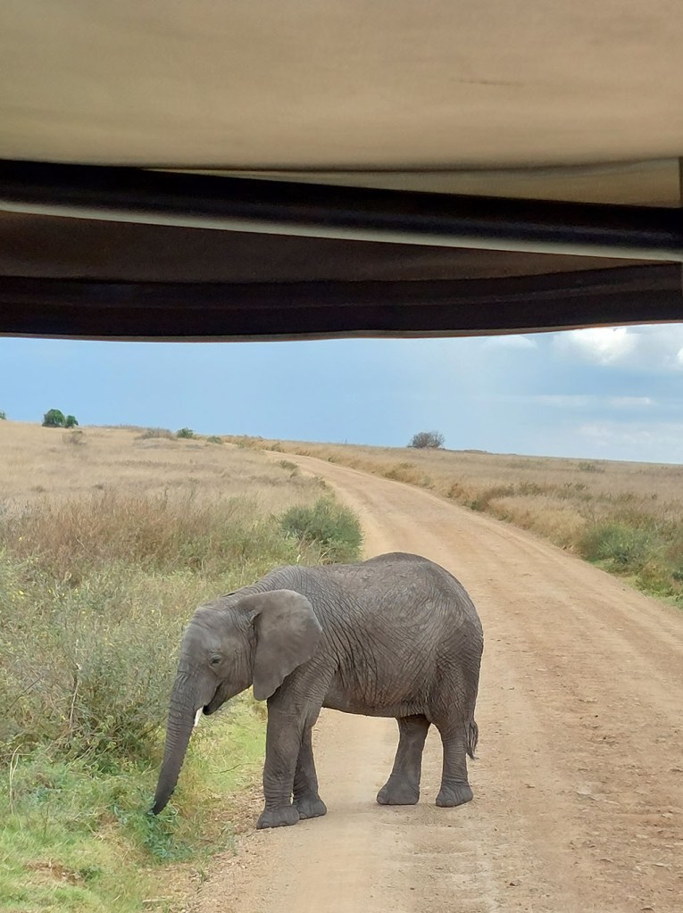 Tu negde na putu, sa naše leve strane, ugledali smo majku i mladunče afričkih slonova. Ovog puta nije bilo krdo. Mladunče se veselo valjalo po prašini dok je mama brstila lišće sa žbunja. Kao i u svakoj sličnoj prilici, Fredi bi zastao što je moguće bliže životinjama ali nikada ne bi sišao sa puta. Kako su se životinje kretale tako bi i naš vodič pratio njih. Druženje sa malom porodicom je trajalo oko 20 minuta. U nekom momentu su se skroz približili našem vozilu. Mladunci slonova su neverovatno radoznali pa tako i ovaj vragolan koji je želeo da sazna što više o nama, a možda i da se poigra. Ostao je na putu na nekoliko metara ispred terenca, malo osmatrajući nas glumeći šmekerčića, a malo brsteći lišće. Mama je prešla na drugu stranu puta, zastavši na trenutak da nas osmotri. U svom poslu traganja za hranom, povremeno obrativši pažnju na nas, šmekala je žbunje bogatije hranom. Nakon nekoliko minuta, pozivom koji smo i mi čuli, a mladunče jedino razumelo, otrčalo je sa puta ka mami, bacivši poslednji pogled na nas praveći pokrete surlom kao da nam je mahalo želeći da nas pozdravi. A možda to i jeste bio pozdrav. Tu smo se rastali i otišli dalje. Slonovi su tako neverovatno velike ljubavi! Nauka je za ove životinje ustanovila da su jedine, uz ljude, koje su svesne fenomena smrti i koje pate za svojim umrlim.