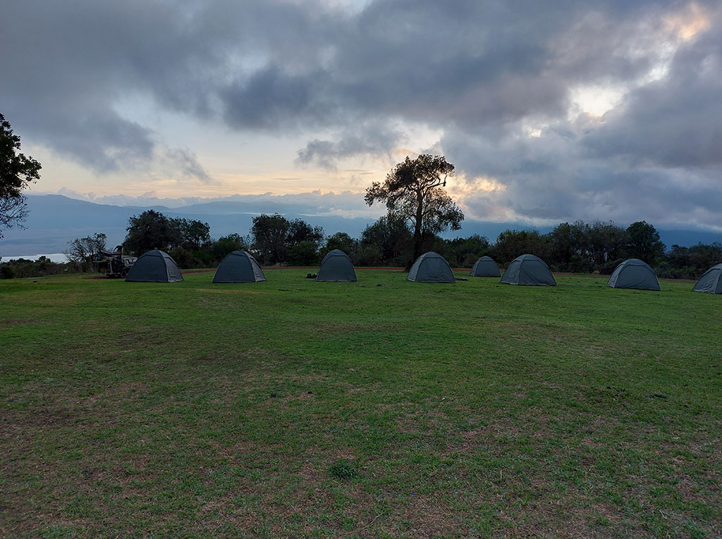 Simba kamp se nalazi na obodu kaldere Ngorongoro, na oko 2.400 metara iznad nivoa mora. I ovaj je kao i prethodni potpuno opremljen svime što je neophodno kamperima. Kuhinja, tuš kabine, toaleti i prostor za šatore. I neograđen, naravno, a na par desetina metara odatle slonovi i žirafe su brstili lišće. Kada je noć prekrila pejzaž u kamp su ušetale i waterbuck.