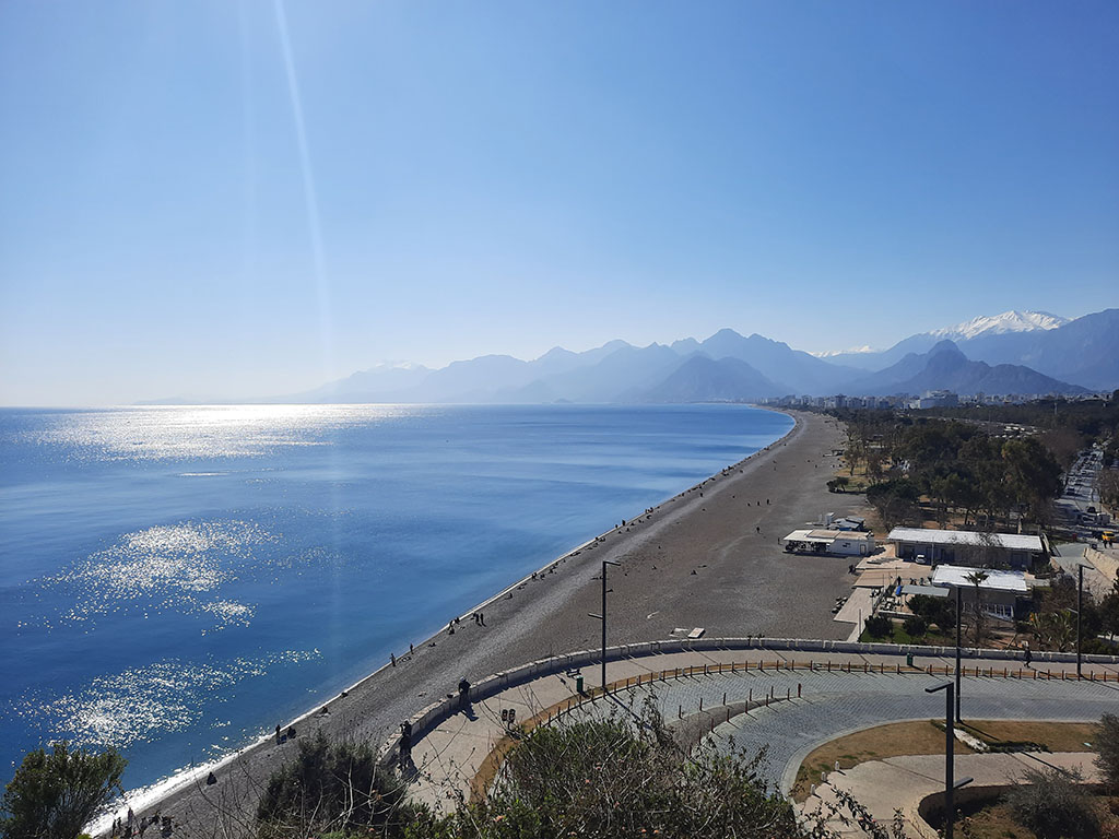 Još jedna dragocena tačka Antalije i magnet za turiste jeste gradska plaža, 5km zapadno od starog jezgra. Moj izbor je kao i obično đon-transport, ali opcije su pored tabananja još i tramvaj, bus ili taxi. Plaža se razvlači uz obalu oko 8km svoje dužine. Široka je i šljunkovita, a u pozadini red zelenila pa red restorana i pabova koji zatim prerastaju u hotele i grad u širem smislu. Mene je čitav pojas podsetio na Adu Ciganliju. Nakon sve te pređene kilometraže, ako baš želite, možete obići i novu gradsku luku. Ogromna je i krcata ukotvljenim prekookeanskim transportnim trajektima, brodovima ratne mornarice, jedrilicama, jedrenjacima ali i uredno upakovanim jahtama svih veličina. Evropa je zatvorila svoja pristaništa za Ruse ali ne i Turska. Ta činjenica je primorala mnoge oligarhe da svoje lepotice prebace i uparkiraju baš u vodama Antalije. I na ulicama grada ruski jezik je vrlo uobičajen, kao i tekstovi usluga koje nude trgovci i ugostitelji na svojim izlozima i reklamnim tablama. Posle luke, za radoznalce, naići ćete na dodatno parče plaže, neuređeno i intimnije, a potom još jedno manje sidrište. I to bi bio kraj grada sa te strane.