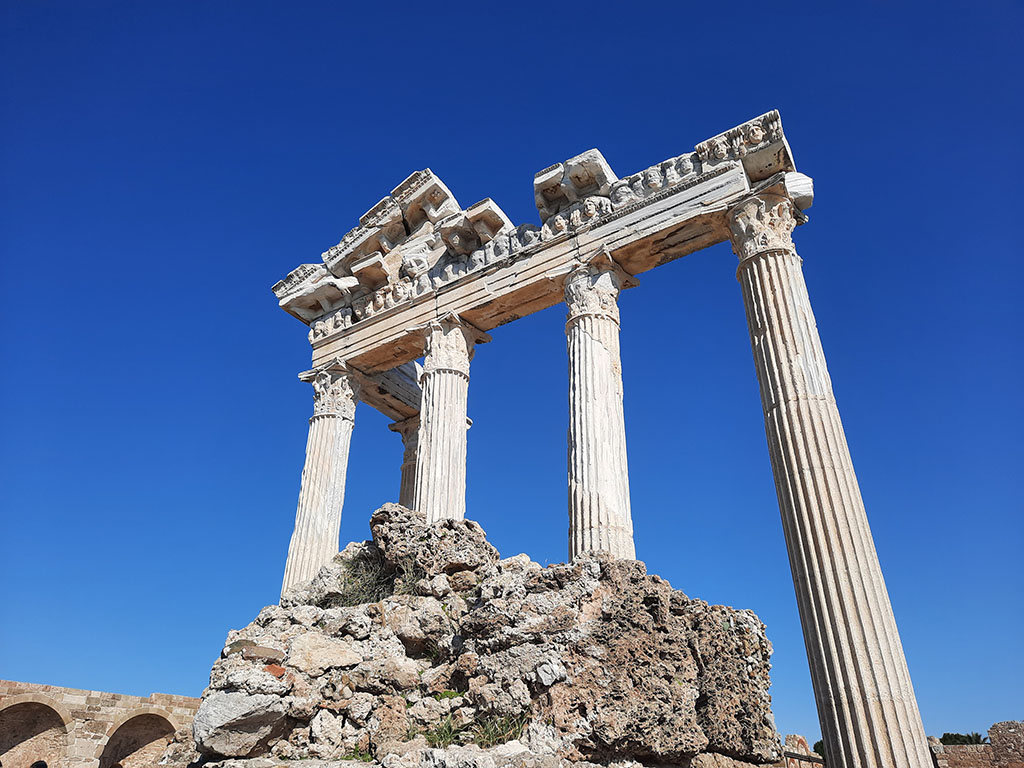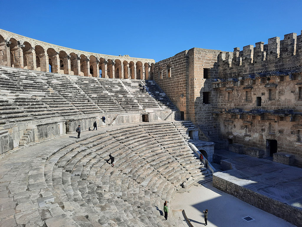 Aspendos je izgrađen u drugom veku nove ere. Potpuno je očuvan i u funkciji. Rimski teatar iz doba Marcusa Aureliusa prečnika je 96 metara i ređa 41 red što su mogli da ugoste 12.000 posetilaca. Akustika je savršena i to sami možete da testirate. Oko teatra je pronađeno šezdesetak rupa u kojima su se nalazili pričvršćivači kanapa koji bi zategli platno preko tribina. Impresivno! Korišćen je kao karavan-saraj u vreme Otomana. Ondašnji gospodari nisu mogli a da ne ugrade muslimanski luk iznad ulaza u arenu kao simbol Alaha, gospodara neba. Danas se koristi za koncerte i pozorišne predstave.